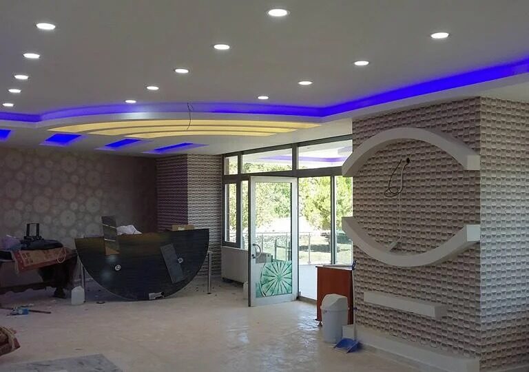 Asma tavan Antalya projelerinde düz yüzeyli klasik uygulamaların yanı sıra, farklı kotlarda ve formlarda tasarlanan dekoratif asma tavanlar da oldukça popülerdir. Dairesel, kademeli, gizli ışıklı ya da geometrik şekilli alçıpan tavanlar mekânlara karakter katar.
